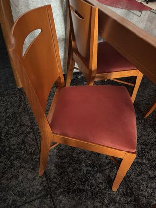 Conjunto de mesa de comedor con cuatro sillas de madera. - 1x Mesa extensible de madera oscura. - 6x Sillas con asientos tapizados. 150x80 (puede llegar a algo más de 220 de largo extendida). Es una mesa antigua, tanto la mesa como las sillas tienen algunos desperfectos pero son totalmente funcionales. Ideal si buscas algo vintage o te gusta restaurar muebles. Sistema de montaje de patas muy sencillo (ver fotos).