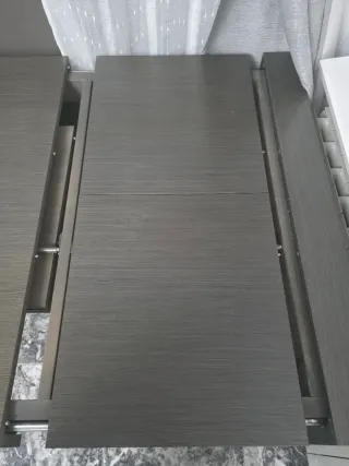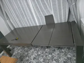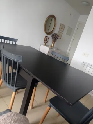 Mesa de comedor extensible de Ikea, ideal para adaptar a tus necesidades. - Diseño moderno y funcional. - Acabado en madera oscura. Tiene poco uso pero de los años tiene las esquinas un poco dañadas y algún rasguño en las patas. Regalamos las cuatro sillas que si que tienen más uso. Medidas 140/195 x 85 cm