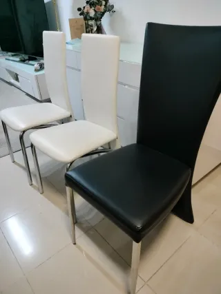 **Venta por mudanza: Abierto a propuestas por lotes de productos** Conjunto de mesa y sillas - Mesa blanca con patas de madera. - Cuatro sillas (dos blancas, dos negras) con patas de madera. -Mesa: rectangular con tablero blanco de MDF y patas de madera maciza. Medidas: Largo 121 cm Ancho: 71 cm Alto: 76 cm 2 Sillas blancas: polipropileno y madera de haya 2 sillas negras: cuero sintético y madera de haya Antes de asegurar la compra, por favor verificá bien las medidas y el espacio donde va a ir el producto. Desarmarlo y prepararlo lleva tiempo, así que asegurémonos de que realmente te encaje 😊 ¡Gracias por la comprensión!