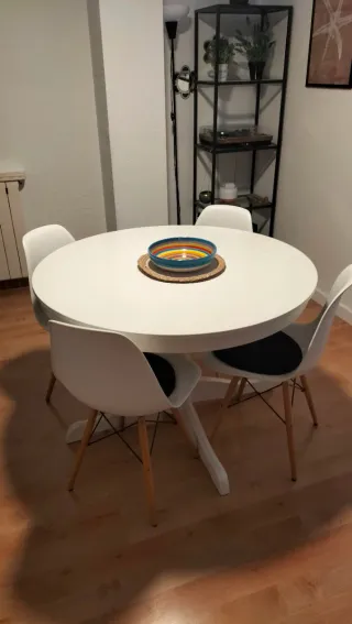 Mesa redonda extensible de diseño moderno. Ideal para dar un toque elegante a tu comedor. Con 4 sillas muy cómodas - Patas de madera. - Tablero blanco.