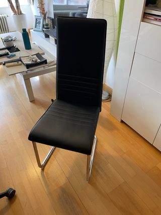 Conjunto de cuatro sillas de comedor con un diseño moderno y elegante. - Patas de metal cromado. - Asiento y respaldo tapizados en polipiel negra. 2 de las sillas tienen ligeros desperfectos en el respaldo como se puede ver en la última foto pero casi inapreciables. Venta por mudanza