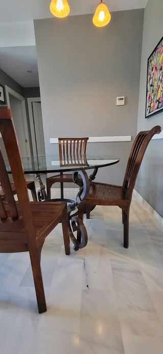 Vendo conjunto comedor de primera calidad. Cristal de casi 2 cm grosor, base hierro macizo con patas de hierro de 30 mm x 30 mm. Incluye conjunto de sillas de primera calidad en madera maciza. Todo en perfecto estado. Ideal para recibidor en espacios grandes o para uso en vivienda.