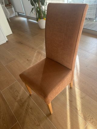 Conjunto de seis sillas de comedor con estructura de madera y asiento tapizado color marrón. - Diseño moderno y elegante. - Tapicería color marrón cómoda y resistente. - Patas de madera robustas. - Incluye cubre tapiz en color naranja. La tapicería en perfecto estado debido a las fundas, la madera con algun toque del uso pero en muy buen estado.