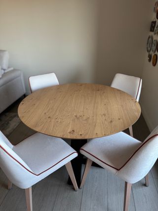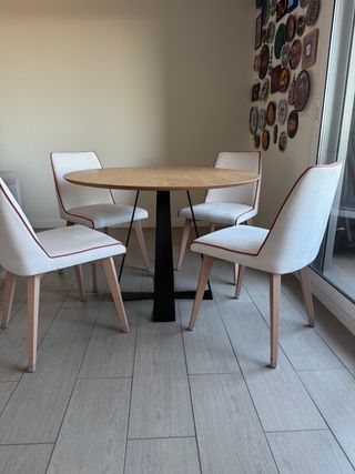 Conjunto de mesa redonda y cuatro sillas estilo nordico. 6 meses de uso, esta como nueva solo tiene marca de boli en una silla que hizo mi niño y marca de apoyarla contra la pared, estan ambas fotos para ver los detalles. Vendo todo por mudanza al exterior. Se retira por mi domicilio. - Diseño moderno y funcional. - Patas de madera para un toque cálido. - Asientos de plástico blanco.