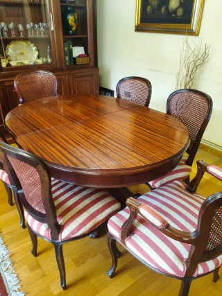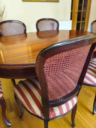 Precioso conjunto de comedor de estilo clásico, elegante y atemporal. Ideal para dar calidez y carácter a cualquier salón. 🔹 Mesa ovalada extensible en madera maciza con acabado brillante y veta espectacular. Incluye sistema de extensión central muy fácil de usar. Estructura robusta con base central decorativa tallada. 🔹 6 sillas a juego, estructura de madera maciza color caoba, respaldo de rejilla (cannage) y asiento tapizado en tela de rayas rojo/beige. 2 de ellas con reposabrazos (tipo cabeceras). 📏 Capacidad: 6–8 comensales cómodamente. Con algunos signos de uso