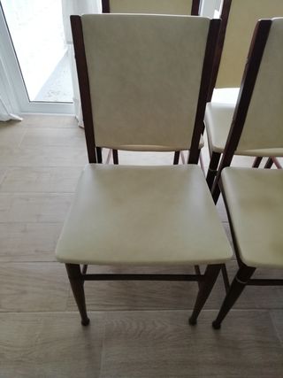 Se venden seis sillas de comedor de estilo vintagepara salón. Están en buen estado para su edad. Están en La Palma. - Estructura de madera color marrón. - Asientos de piel sintética color beige. - Patas de madera torneadas.