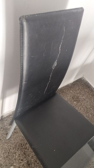 Conjunto de mesa de comedor con 4 sillas. La mesa tiene sobre de cristal transparente y patas metálicas. Las sillas son de símil piel negra. Presentan algunas señales de uso en la tapicería. -Sobre de cristal transparente. -Patas metálicas. -4 sillas de símil piel negra. 150x80cm las sillas están estropeadas el tapizado