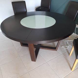 Conjunto de comedor compuesto por: - Mesa de comedor de madera maciza con dos tableros de extensión. Modelo Bjursta de Ikea. Medidas: 140/180/220*84 cm. Color wengue. - Conjunto de 6 sillas de madera maciza, en color wengue, tapizadas con tratamiento antimanchas. A recoger en La Laguna.