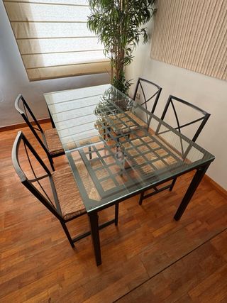 Preciosa mesa de comedor de cristal con estructura metálica. Se incluye la mesa y seis sillas. La mesa tiene un diseño elegante y moderno. Las sillas son de madera envejecida con asientos de tela beige. Están en buen estado, con algunas señales normales de uso. - Mesa de cristal templado. - Estructura metálica plateada. - Seis sillas incluidas. - Estilo elegante y moderno. 0,90 x 1,65 cm ampliable 2,10 cm
