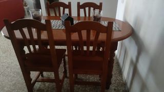 Se vende conjunto de mesa de comedor extensible de madera (medida cerrada: 1,40 m) con 4 sillas a juego. La mesa incluye pieza adicional de madera para extenderla y ganar más espacio. Color: madera tono cerezo. Sillas con respaldo alto y asiento tapizado en azul, muy cómodas. Conjunto robusto, elegante y en buen estado. Ideal para salón o comedor, práctica para reuniones familiares o cenas con amigos.