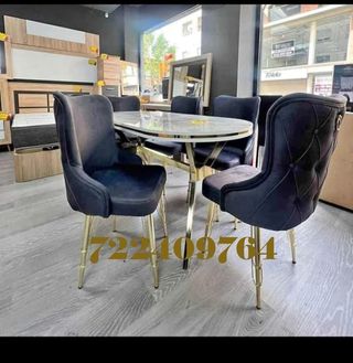 Elegante conjunto de mesa con sobre de mármol y sillas tapizadas en terciopelo. - Diseño moderno y sofisticado. - Patas de metal dorado. - Sillas con respaldo capitoné y aro decorativo.