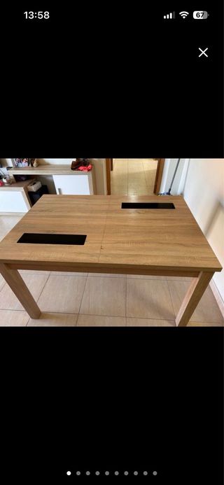 Dale un toque moderno y elegante a tu comedor con este pack completo! Todo está en perfecto estado, casi nuevo y muy cuidado. Incluye: • 1 mesa de comedor de cristal con base de madera maciza estilo cruz (modelo AGERBY del JYSK). Ancho: 90 cm Longitud: 160 cm Altura: 75 cm • 1 mesa baja de centro, también de cristal y madera a juego (modelo AGERBY del JYSK). Ancho: 60 cm Longitud: 100 cm Altura: 45 cm • 4 sillas negras de diseño moderno, cómodas y resistentes. (En buen estado) Precio pack todo junto: 360€ Precio por separado: - Mesa comedor: 180€ - Mesa auxiliar de centro: 150€ - Sillas: 50€