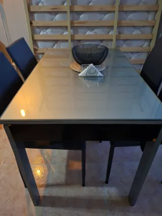 Mesa de comedor extensible de aluminio y cristal negro. Amplía su capacidad para acomodar hasta 6 sillas cómodamente. Se regalan las 4 sillas que tiene. - Diseño moderno y funcional. - En bastante buen estado.