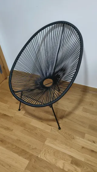 Silla de diseño Acapulco en color negro. Su estructura de metal y plástico la hace resistente y ligera. - Patas metálicas finas. - Asiento tejido con cuerdas.