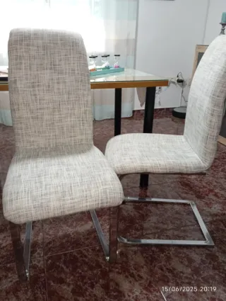 Conjunto de seis sillas de salón con un diseño moderno y elegante. - Tapicería en polipiel (para tapizar o funda) - Patas metálicas cromadas. La estructura de la silla está en perfectas condiciones pero la polipiel se está pelando por lo que son ideales para ponerles una funda y/o tapizarlas Están en buen estado excepto lo descrito de la polipiel 18€ cada una