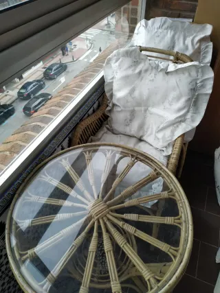 Conjunto de mesa y 2 sillas de mimbre con un diseño natural y acogedor. - Mesa con encimera de cristal. - Sillas de mimbre con cojín.