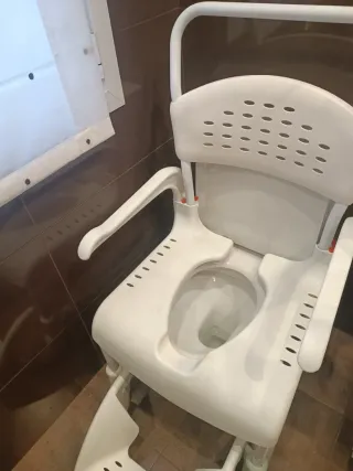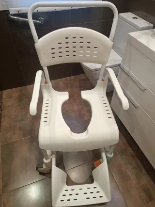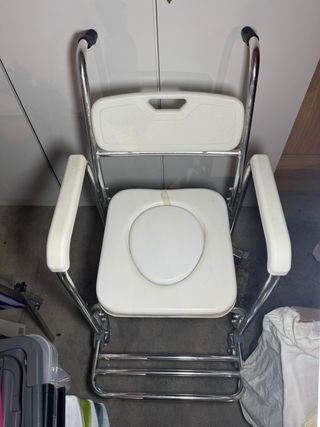 Silla versátil para usar en el WC o la ducha, equipada con ruedas para facilitar su movilidad. Nunca se ha usado para hacer sus necesidades solo usado en ducha. Con ruedas, resistente hasta 120kg, y cubeta extr6 - Estructura metálica plateada. - Asiento y respaldo de plástico blanco. - Ruedas para desplazamiento.