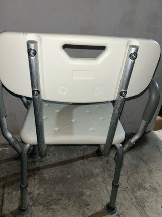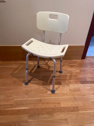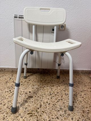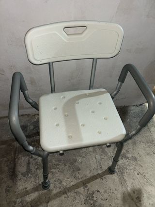 Silla para personas con poca estabilidad en la ducha (y riesgo de caída) para facilitar la higiene sin riesgo de caer o resbalar. Silla ergonómica y muy práctica. Detalles: - Asiento con orificios para el drenaje del agua. - Reposabrazos. - Patas ajustables en altura. No ha sido muy usada.