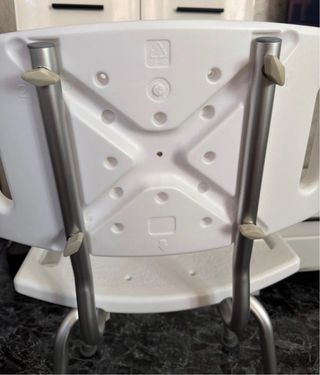 Silla de ducha con asiento y respaldo. - Altura regulable. - Asiento con orificios para drenaje. - Patas antideslizantes.