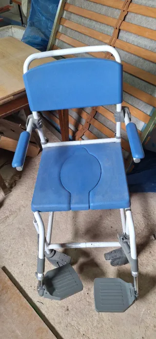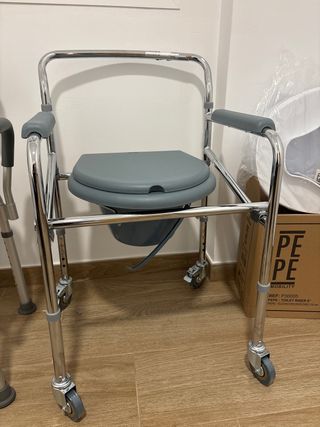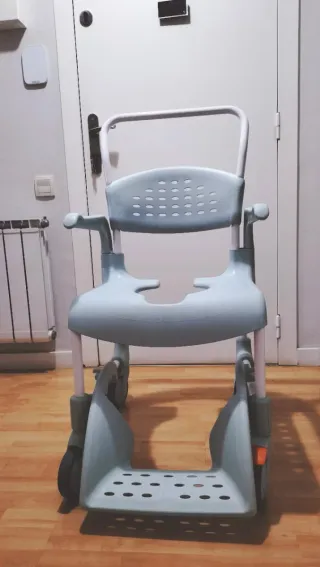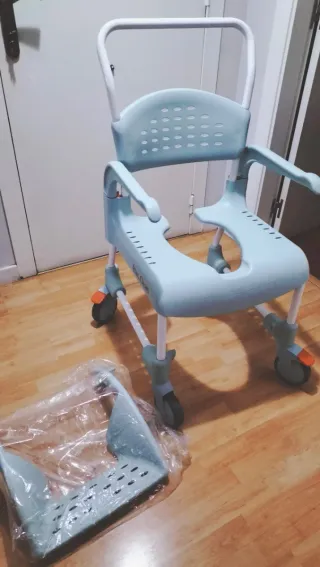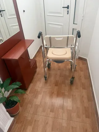Silla de ducha y WC con estructura metálica y asiento de plástico. Los pies son abatibles para mayor comodidad. - Asiento y respaldo acolchados. - Reposabrazos. - Ruedas para facilitar el desplazamiento. La compré en diciembre por un accidente que tuve. Está como nueva. Se entrega limpia y desinfectada. Silla de Ruedas ideal para uso en hospitales, centros de salud, geriátricos, hogares ya que es un producto indicado para personas ancianas, con incontinencia o movilidad reducida dado que facilita el aseo y la higiene diaria.