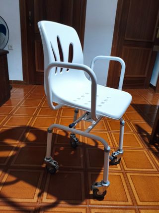 Silla de baño con asiento giratorio y ruedas para facilitar el acceso a la ducha. Perfecto estado. Se vende porque la a persona que la utilizaba ya no la necesita. - Asiento con orificios para el drenaje del agua. - Reposabrazos para mayor comodidad y seguridad. - Altura regulable en las patas. - Ruedas para movilidad.