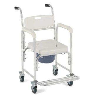 Silla de ducha y WC con ruedas, diseñada para facilitar el acceso y la movilidad. - Estructura metálica plateada. - Asiento y respaldo acolchados en blanco. - Reposabrazos abatibles. - Ruedas para fácil desplazamiento.
