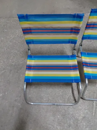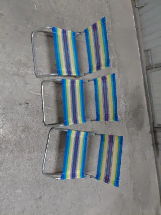 Conjunto de tres sillas plegables, perfectas para llevar a la playa o de camping. Son ligeras y fáciles de guardar. - Estructura metálica. - Asiento y respaldo de tela a rayas.