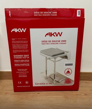Silla de ducha plegable de la marca AKW. Es un asiento de plástico diseñado para facilitar el acceso y la seguridad en la ducha. - Asiento plegable para ahorrar espacio. - Patas ajustables en altura. - Diseño seguro y estable.