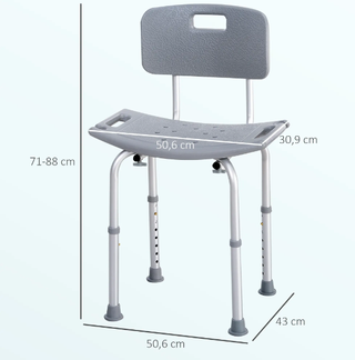 Silla de ducha HOMCOM con respaldo y asiento ergonómico. - Asiento contorneado para mayor comodidad. - Patas ajustables en altura. - Respaldo con asa. - Diseño antideslizante. ALTURA AJUSTABLE: La silla de ducha para personas mayores se adapta sin esfuerzo a las necesidades individuales de cada usuario con sus patas ajustables en 8 posiciones, proporcionando la máxima comodidad con un rango de altura de 71 a 88 cm en total - MONTAJE SIN HERRAMIENTAS: El montaje es sencillo y no requiere herramientas. Este taburete para ducha se puede montar fácilmente en cuestión de minutos, siguiendo las instrucciones incluidas Referencia 72-0009