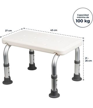 Banqueta de ducha con altura regulable y gran capacidad de carga. - Altura ajustable entre 21 y 26 cm. - Ancho de 43 cm y profundidad de 27 cm. - Capacidad máxima de 100 kg.