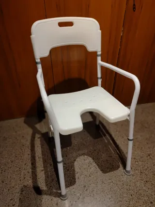Silla de ducha en buen estado, ideal para personas con movilidad reducida. - Estructura de aluminio ligero y resistente. - Asiento de plástico con agujeros para drenaje. - Reposabrazos para mayor seguridad.