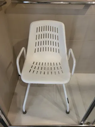 Silla para personas con poca estabilidad en la ducha (y riesgo de caída) para facilitar la higiene sin riesgo de caer o resbalar. Silla ergonómica y muy práctica. Detalles: - Asiento con orificios para el drenaje del agua. - Reposabrazos. - Patas ajustables en altura. No ha sido muy usada.
