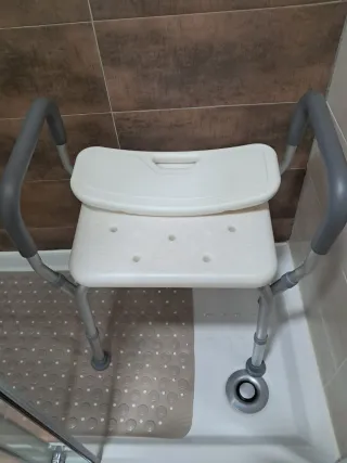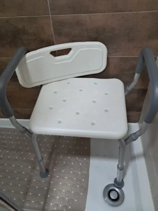 Silla de ducha con asiento y respaldo a estrenar. - Asiento con forma ergonómica. - Respaldo con asa. - Patas ajustables en altura. - Brazos de apoyo.