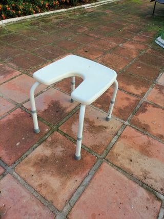 Taburete diseñado para el baño, con asiento antideslizante y altura ajustable. - Asiento ergonómico con textura. - Patas con bases de goma para mayor estabilidad. - Altura regulable mediante sistema de clip. - Poco uso. - Lo envío desmontado. Fácil de montar. - Solo algún roce en los tacos
