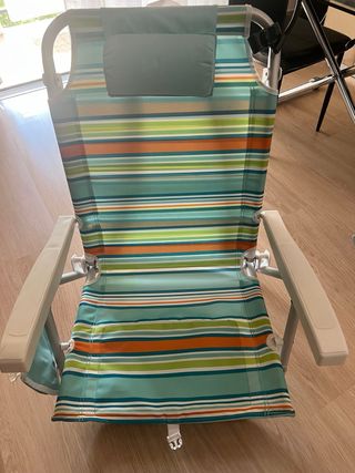 Silla plegable para playa o jardín. Está en buen estado, aunque tiene alguna pequeña marca de uso en los reposabrazos. - Estructura de aluminio. - Tejido de rayas azules y blancas.