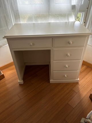 Mesa de escritorio de madera de pino .En buen estado .pintado a mano.Comprado en muebles Bernardo (Cudillero) - Encimera de madera. - Cajonera blanca con detalles florales. - Espacio para teclado. Medidas anchura 150cm Altura 76cm Profundidad 53cm La silla la vendería por 5€ más ,está perfecta Tengo el cabecero haciendo juego