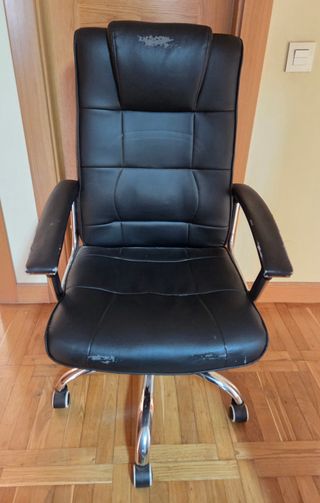Silla de oficina con un diseño ergonómico y moderno.- Respaldo alto. Tiene desgastes en la polipiel, por lo demás funciona perfectamente - Reposabrazos acolchados. - Base giratoria con ruedas.
