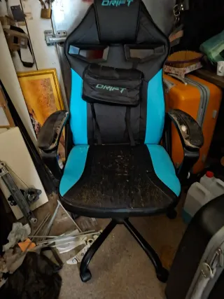 Silla de escritorio con un diseño deportivo en colores azul y negro. Cuenta con un pequeño bolsillo frontal. - Diseño ergonómico. - Base con ruedas. - Marca: DRIFT.