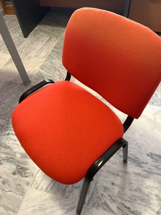 Silla de oficina con un diseño moderno y ergonómico. - Asiento y respaldo tapizados en tela color naranja. - Estructura y patas de metal color negro.