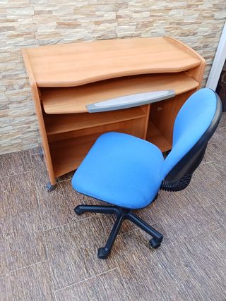 Mesa de escritorio de madera color marrón, práctica y funcional. Dispone de varios compartimentos para organizar libros, material o documentos. Diseño robusto y versátil, ideal para estudio, trabajo o manualidades. Silla de reuniones ergonómica, con suaves líneas curvas y detalles cosidos. Se adapta al cuerpo proporcionando comodidad. Mecanismo de inclinación y altura regulable. 👉 Todo el conjunto por solo 30€. 👉 PRECIO NO NEGOCIABLE