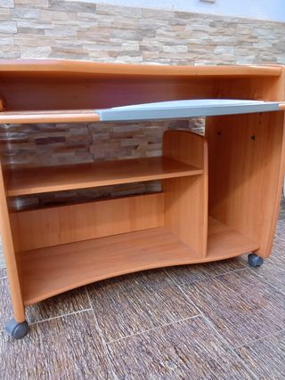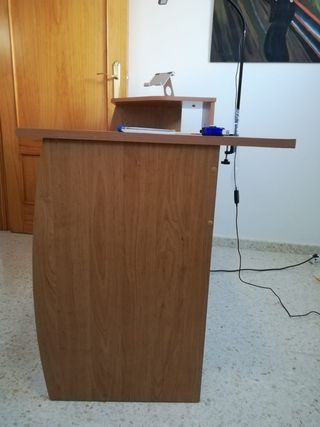 Mesa estudio de 1 metro de largo x 60 fondo y alto 88 cm la parte mas alta,con ruedas y agujero para poner cableado yLa parte de arriba es papel pegado.Si vive en Badajoz capital y no tiene transporte se la podría llevar yo.