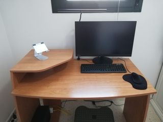 Mesa escritorio de color madera y blanco, se vende con la silla, tiene muy poco uso pero en la última foto se puede apreciar un leve color en la mesa, porque se pinto encima, aunque apenas se nota. Por lo demás está todo en perfecto estado