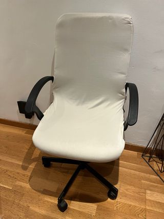 Silla de escritorio giratoria en buen estado. Actualmente lleva una funda blanca que se puede quitar o cambiar fácilmente. Debajo es de polipiel negra. Las ruedas están bastante usadas, así que recomendaría cambiarlas si se va a mover mucho (son ruedas estándar y fáciles de encontrar). Se vende porque hemos comprado una nueva.