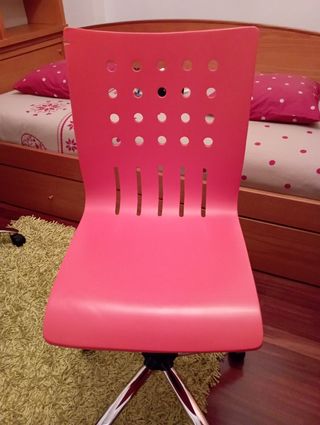 Silla de escritorio SKALBERG de IKEA en color rosa. Ideal para el espacio de estudio o juego. - Diseño con asiento y respaldo perforados. - Base con ruedas para fácil movilidad. - Altura ajustable.