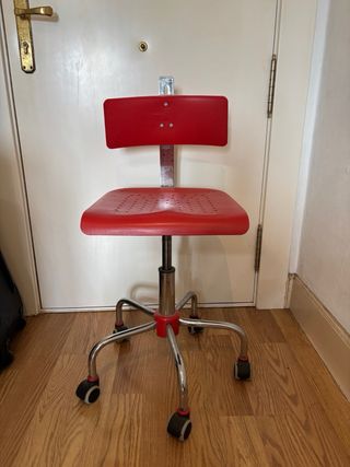 Silla de escritorio de IKEA con un diseño moderno y funcional. Con marcas de uso pero perfectamente usable. Para no gastar dinero en una silla de escritorio para niño hasta la adolescencia (que luego duele tener que tirar). Aprovecha - Asiento y respaldo en color rojo. - Base plateada con ruedas.