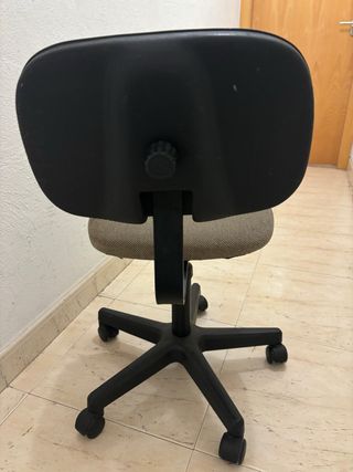 Silla de escritorio con respaldo y asiento. - Respaldo en color negro. - Asiento en color beige. - Base de plástico con ruedas.