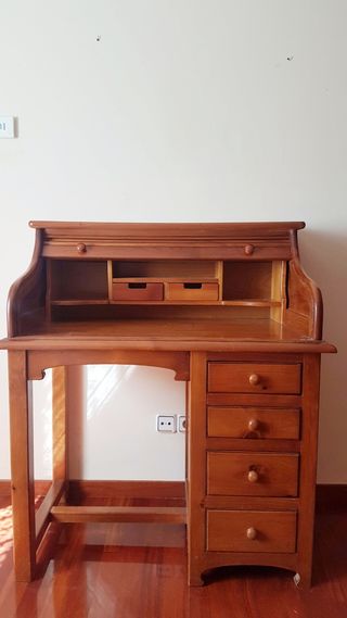 Elegante escritorio de estilo rústico con un diseño clásico y funcional. - Fabricado en madera de alta calidad. - Acabado en tono marrón cálido. - Cuenta con varios cajones para almacenamiento. - Incorpora un compartimento superior con persiana enrollable. -Silla incluida