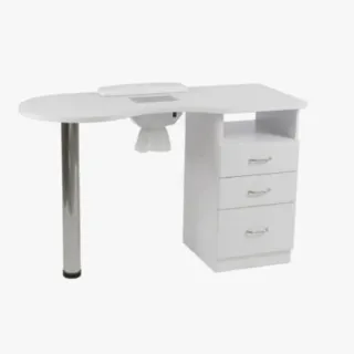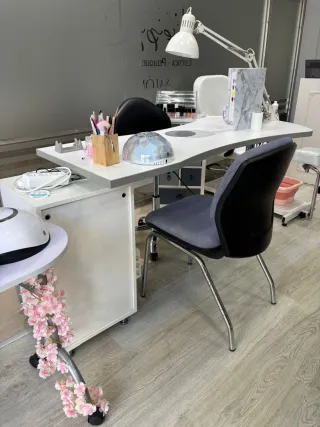 Mesa de manicura profesional con un diseño moderno y funcional. - Superficie de trabajo amplia. - Cajonera integrada para almacenamiento. - Lámpara de escritorio ajustable. - Silla ergonómica incluida.