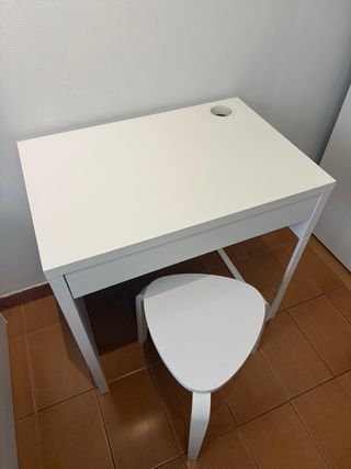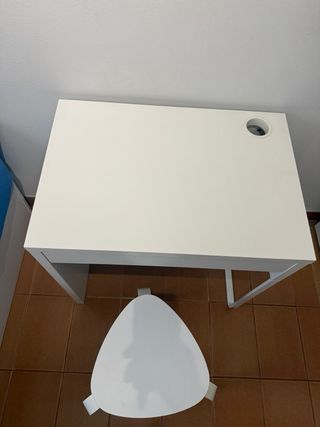 Conjunto de escritorio y silla en color blanco. - Escritorio con un cajón. - Silla con asiento triangular.