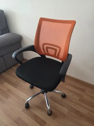 Silla de escritorio con un diseño moderno y cómodo. - Respaldo de malla transpirable en color naranja. - Asiento acolchado en tela negra. - Base metálica con ruedas para fácil movilidad.